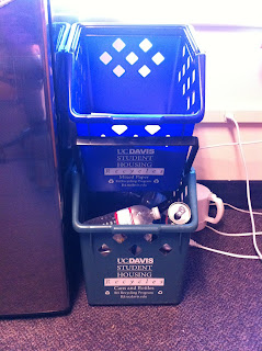 Here at UC Davis in the dorms, housing services provide every room with two recycle bins, one for paper and one for cans and bottles. These bins are specifically designed to improve the recycling habits of the UC Davis campus by making it extremely easy to throw away waste. Also, they are crafted to not take up too much space in the small quarters they are used in. Complete with a lip along their insides, the containers have the ability to stack on top of one another to save space. A college student is more inclined to keep the bins in their room if they do not interfere with more important objects in his or her room. Also, the bins have handles to make transporting the recycles easy. One cannot complain about having to change a bag or about his or her inability to move an awkwardly shaped receptacle. In addition, the containers are color coded so one can make associations. One can quickly pick up that blue means paper and green means cans. With time, one's brain does not even have to think about what goes where, but does it naturally. The University makes a smart move when keeping recycling simple and easy by narrowing it down to two bins. While they are asking you to sort your waste, it is not that extensive. Recycling may require just a bit more effort but they make it simple and accessible enough to where even the laziest student has no problem doing so.